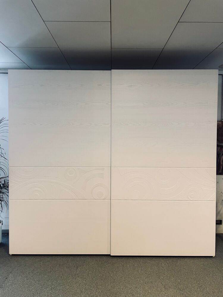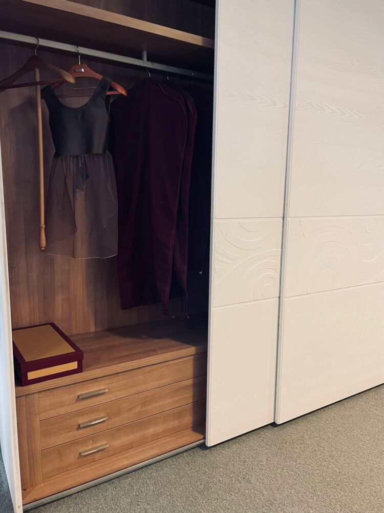 ARMADIO SCORREVOLE ANTA DUNE IN TAMBURATO CON CASSETTI INTERNI LACCATO BIANCO PORO APERTO