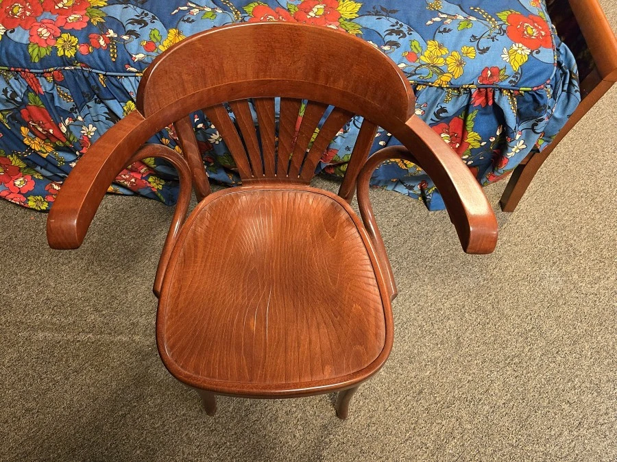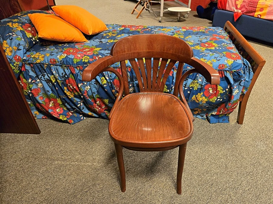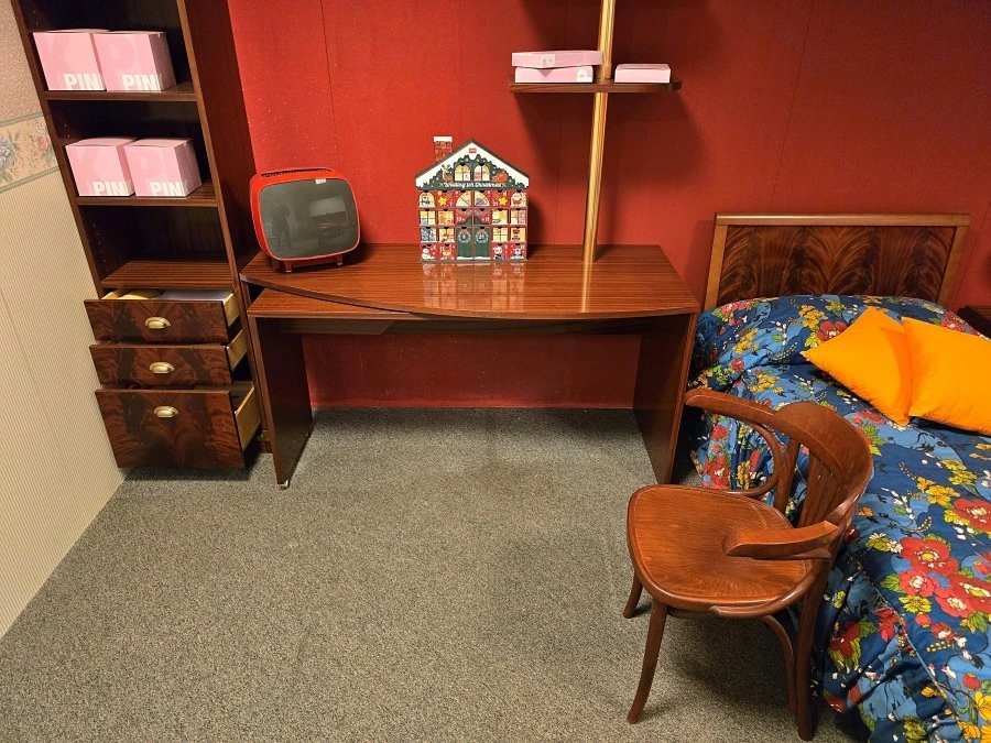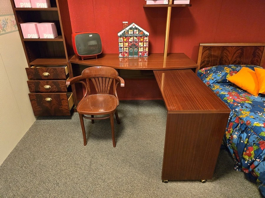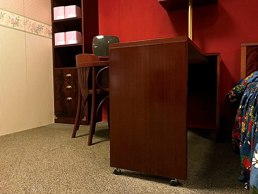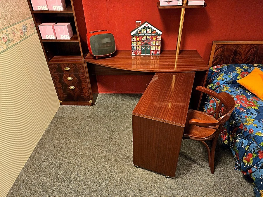 - Scrivania: 2 top in mogano lucido, uno superiore e fisso, uno inferiore e scorrevole su rotelle