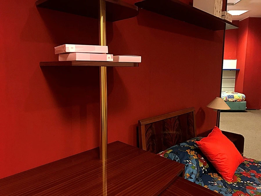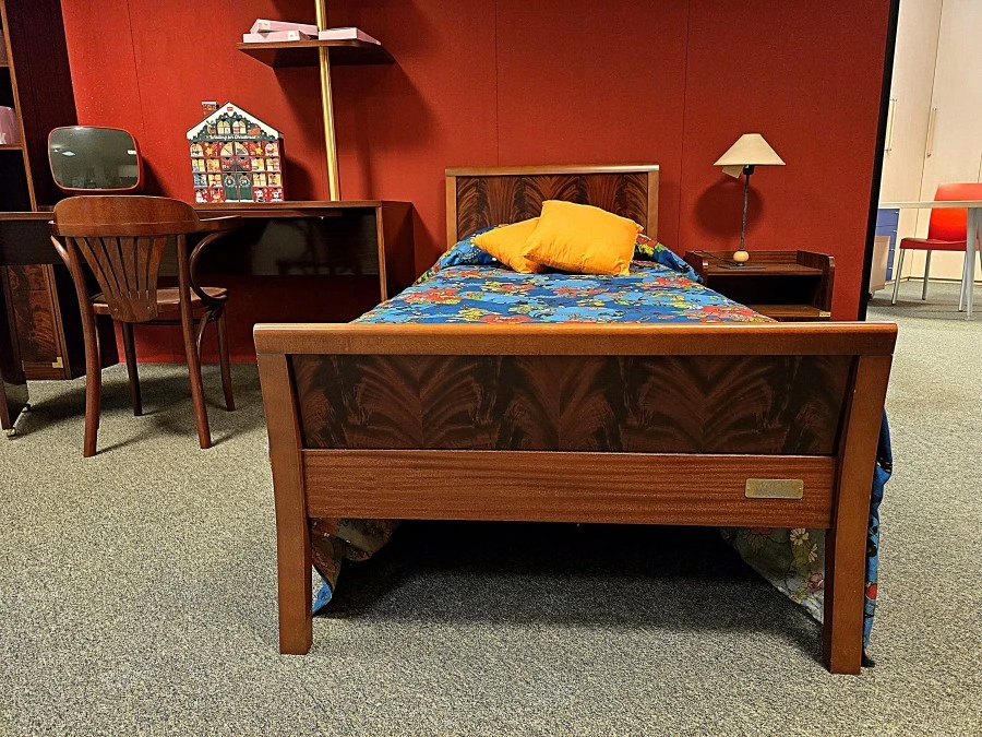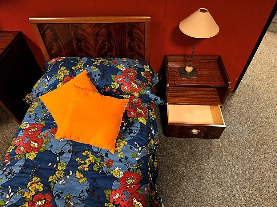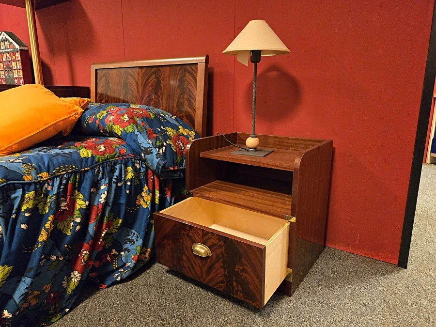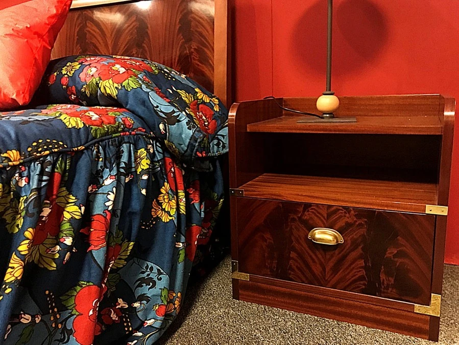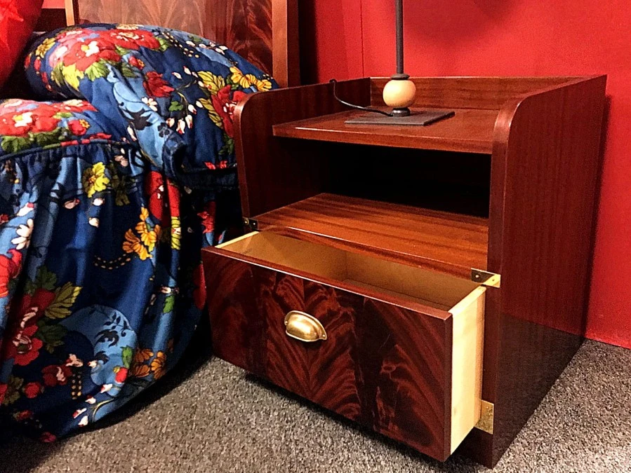 - Comodino: 1 cassetto con frontale in legno di mogano lucido e decorato e cassetto con maniglia in ottone + doppio top in legno di mogano, così da avere un vano a giorno intermedio