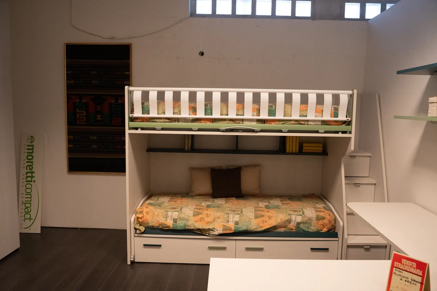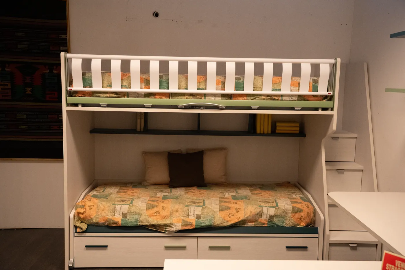 Letto a castello Moretti con letto superiore a ribalta e scaletta contenitore