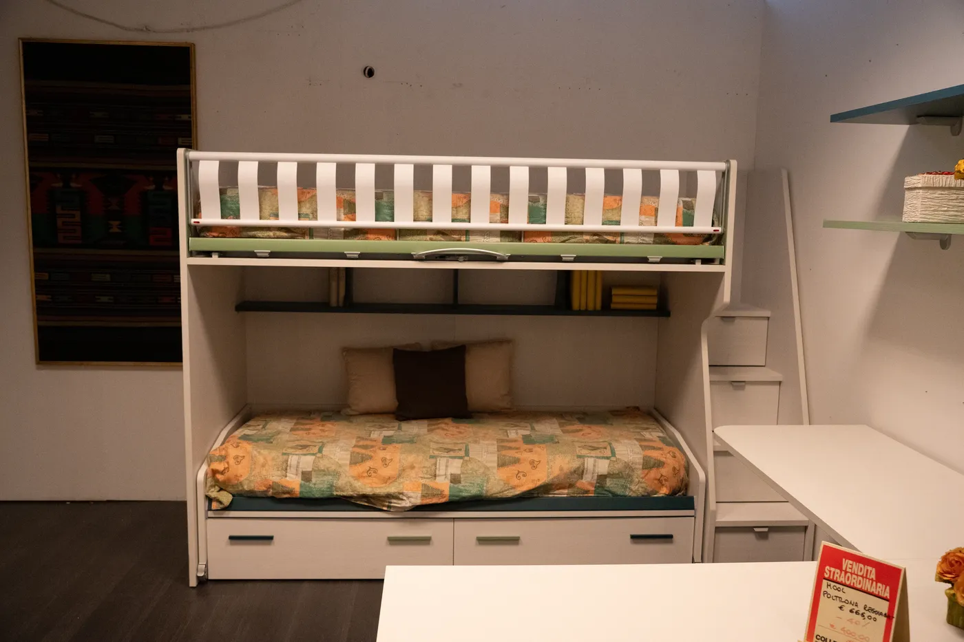 La scaletta contenitore è il dettaglio che fa davvero la differenza: integra vani utili per riporre giochi, biancheria o accessori, aiutando a mantenere tutto in ordine senza aggiungere mobili extra. Una proposta perfetta per chi cerca soluzioni salvaspazio di qualità nel mondo arredamenti Bergamo.