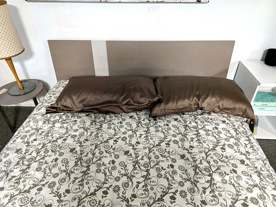 La finitura in materico cemento cava della testiera trova così un contrasto visivo affascinante nell’inserto in cemento chiaro, rendendo questo pezzo d’arredo un vero protagonista della camera da letto.
