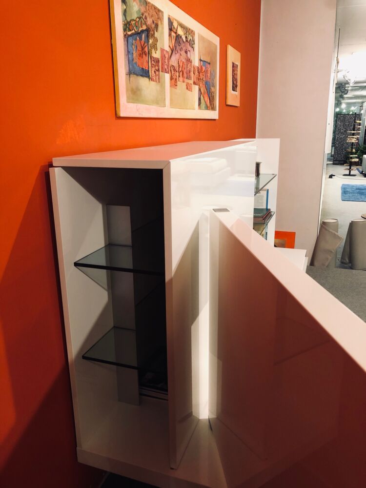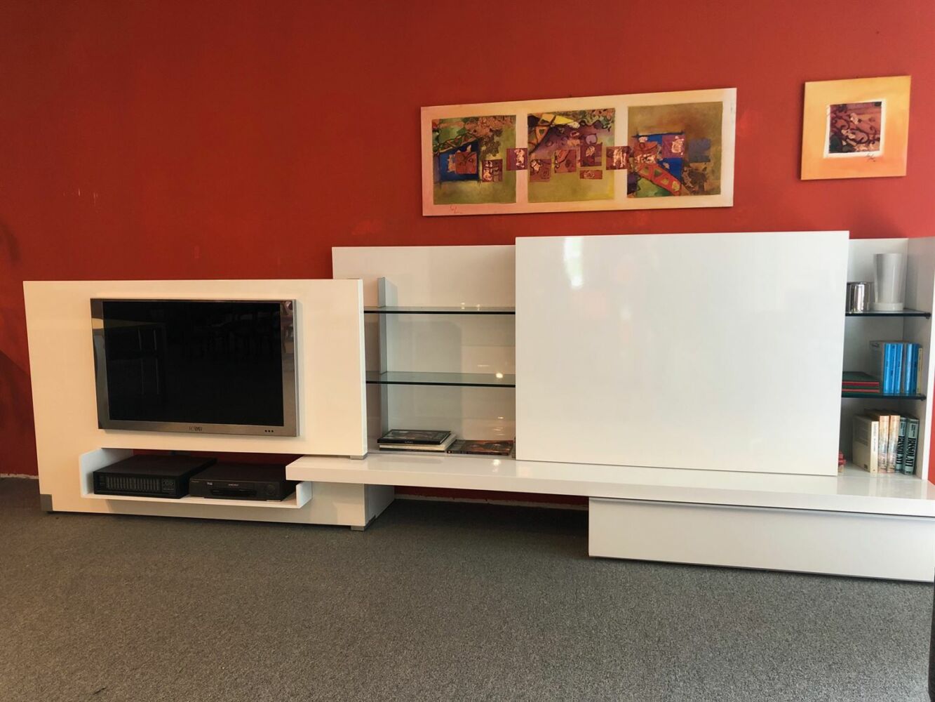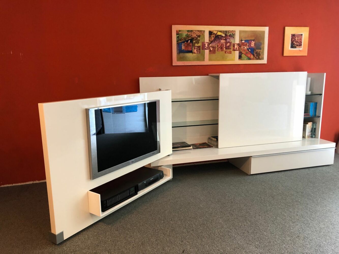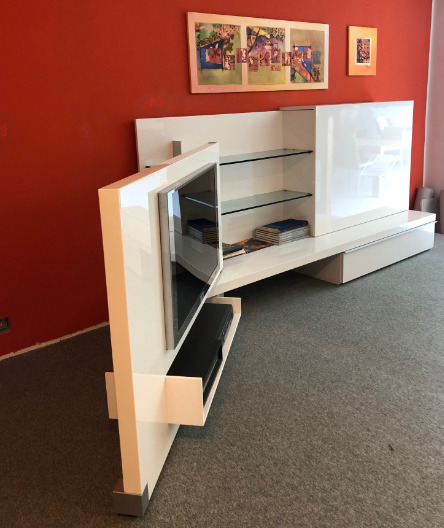 SOGGIORNO LACCATO LUCIDO BIANCO OTTICO 100 CON PANNELLO PORTA TV ORIENTABILE E ANTA SCORREVOLE