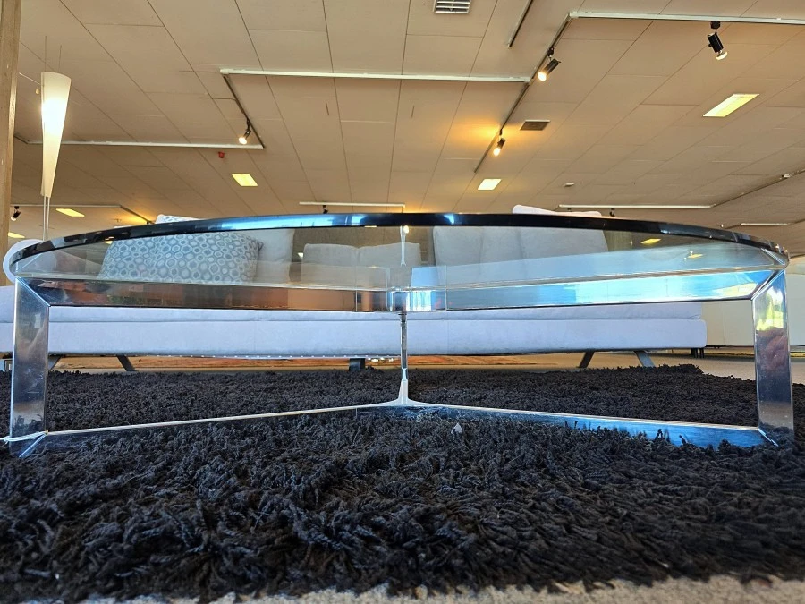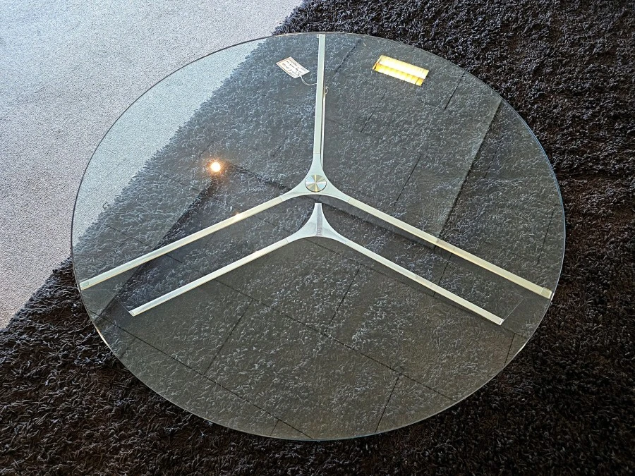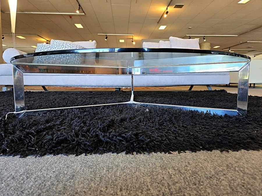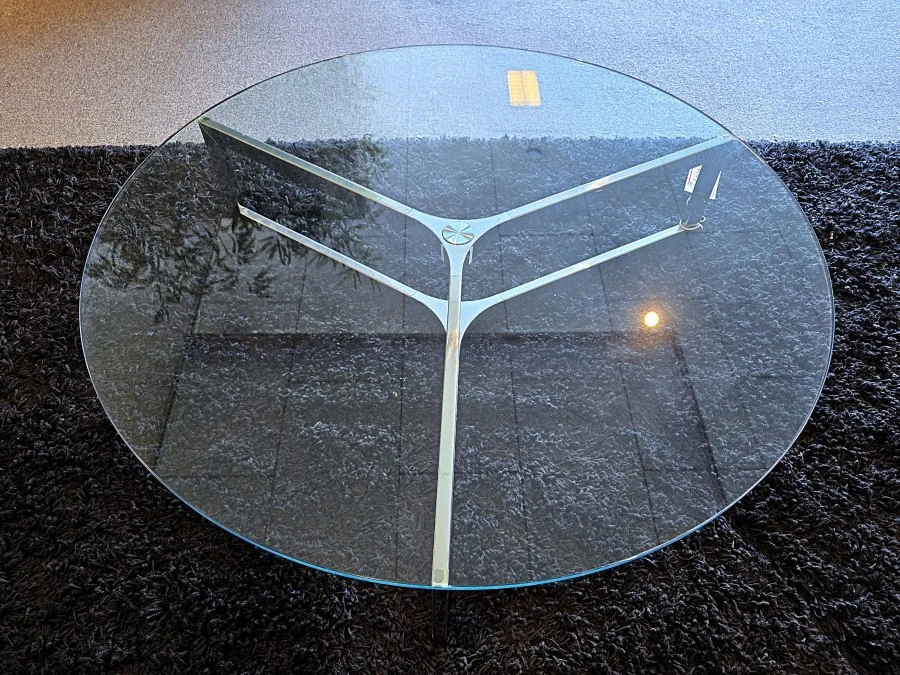 Il giunto centrale in alluminio cromato aggiunge un tocco di sofisticazione, rendendo il tavolino non solo funzionale ma anche un elemento decorativo di grande impatto visivo, mentre le gambe del tavolino, in acciaio inox lucido, garantiscono stabilità e durata nel tempo.